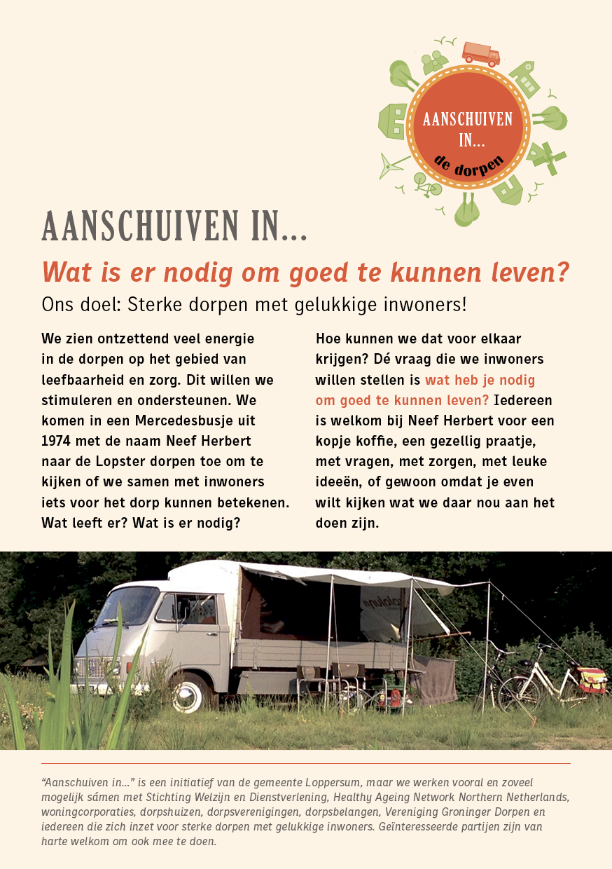 Op donderdag 5 september, van 13:00-17:00, komt “Neef Herbert” bij het dorpshuis in Leermens. Inwoners kunnen hier aanschuiven voor een kopje koffie/thee en praten over het dorp. Dit is een initiatief vanuit de gemeente Loppersum. Klik hier voor meer informatie.